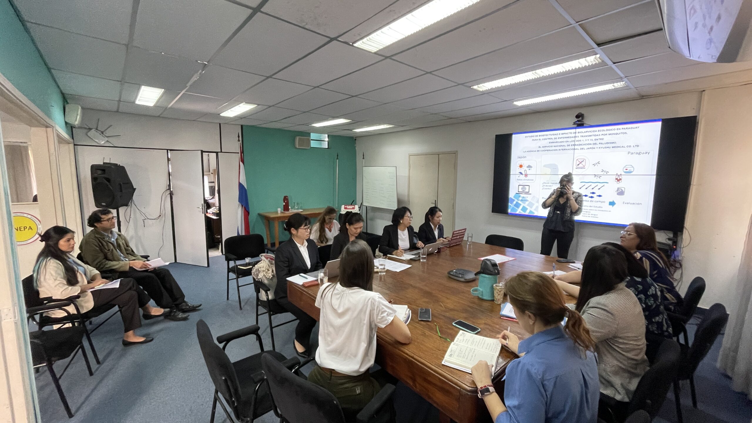 Este proyecto se implementa conjuntamente con el Servicio Nacional de Erradicación del Paludismo (SENEPA), con el objetivo de contribuir al control de enfermedades transmisibles y a la mejora de la salud pública en Paraguay. En agosto y octubre de 2024, el equipo del proyecto, encabezado por su representante de Kyushu Medical, el Sr. Hatano, visitó Paraguay y sostuvo reuniones con representantes de SENEPA. El Director del SENEPA, Dr. José Manuel Jara, y la Directora Técnica, Dra. Yohana Benítez, expresaron sus expectativas respecto a MOSNON y su disposición a colaborar en la prueba de campo.